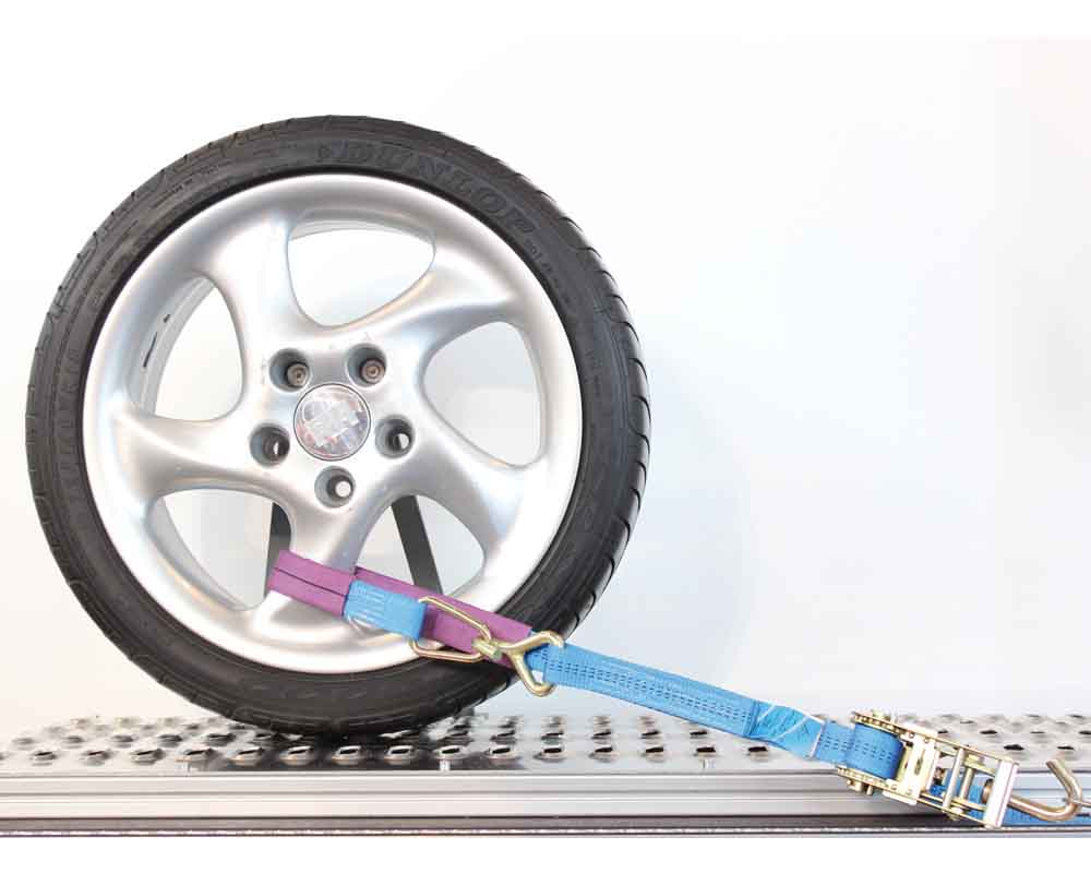 Der zweite Autotransport Spanngurt mit integriertem Schutzschlauch ist für eine schnelle Sicherung, mit direktem Zug am Rad geeignet.